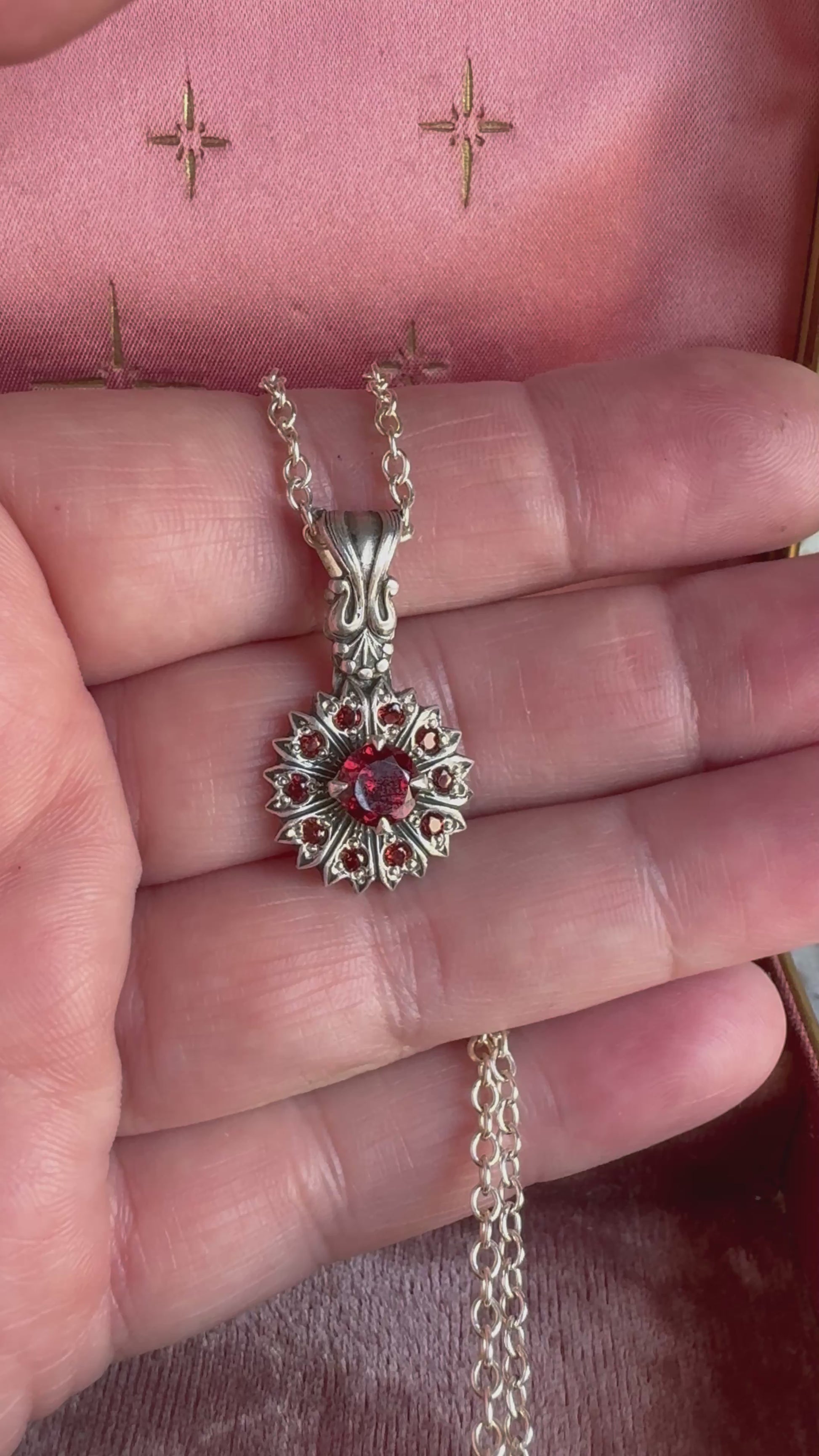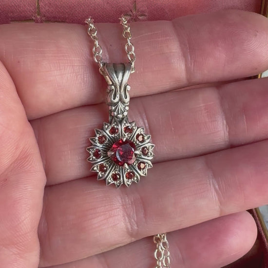 Antique details around every corner of this heirloom necklace! Garnets galore with a 3/4 carat center stone surrounded 10 pave set Garnets in a reimagined antique Victorian setting. An instant sentimental favorite you'll want to wear every day.