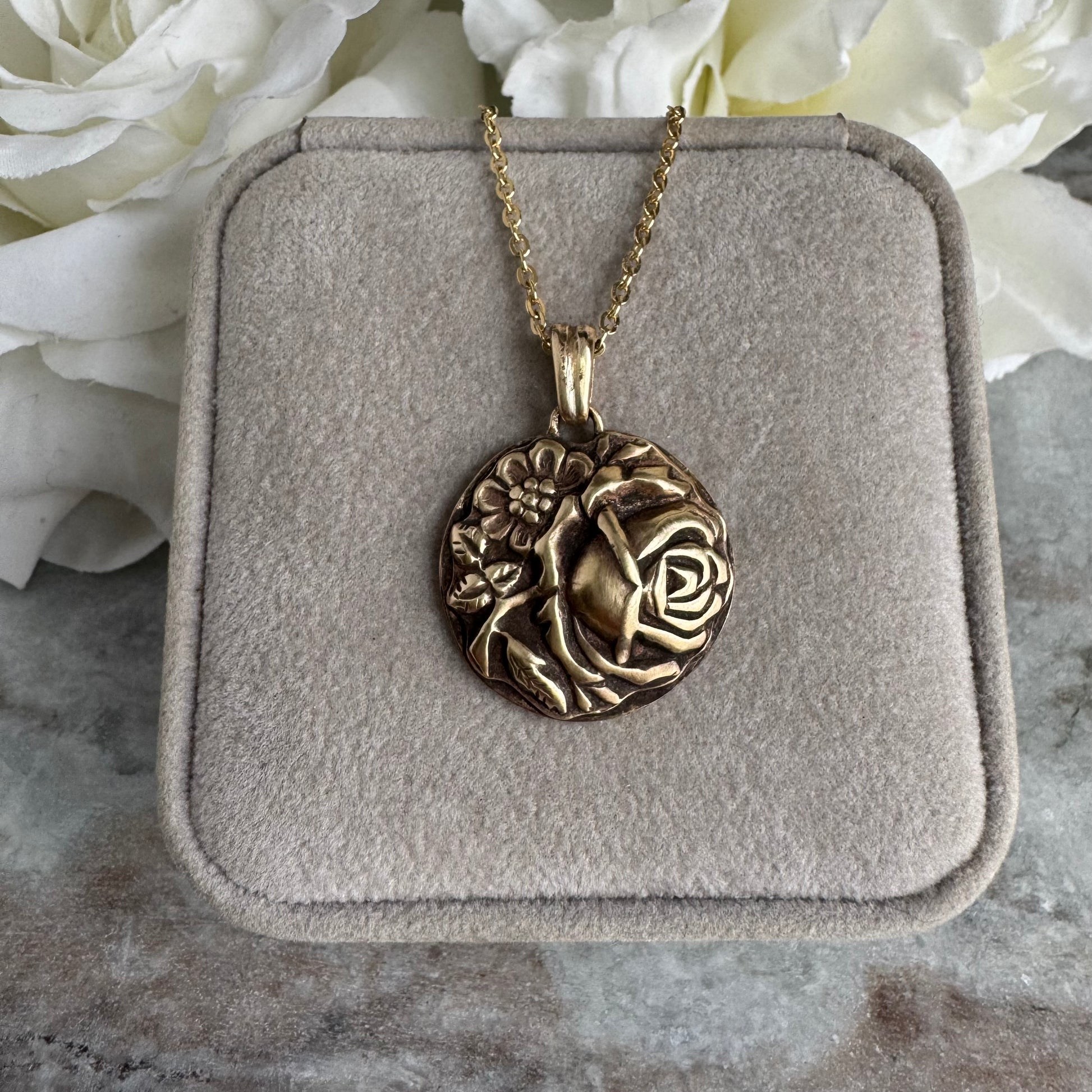 Everything is coming up roses every day with this Victorian rose garden inspired necklace. Hand crafted in an antique impression with heirloom quality brass and hung from a brilliant 14K gold plated brass chain. Perfec for layering up or happy to stand alone.
