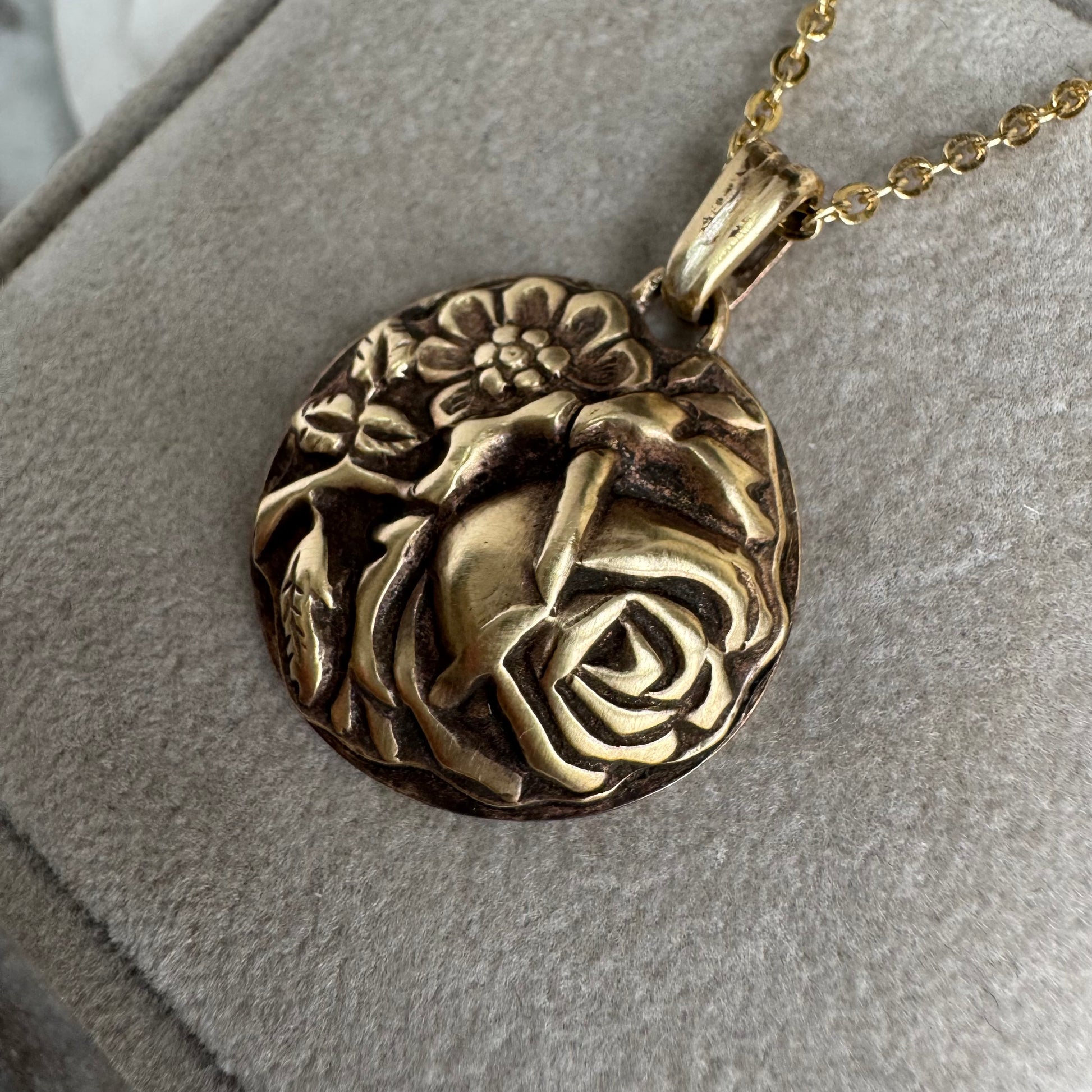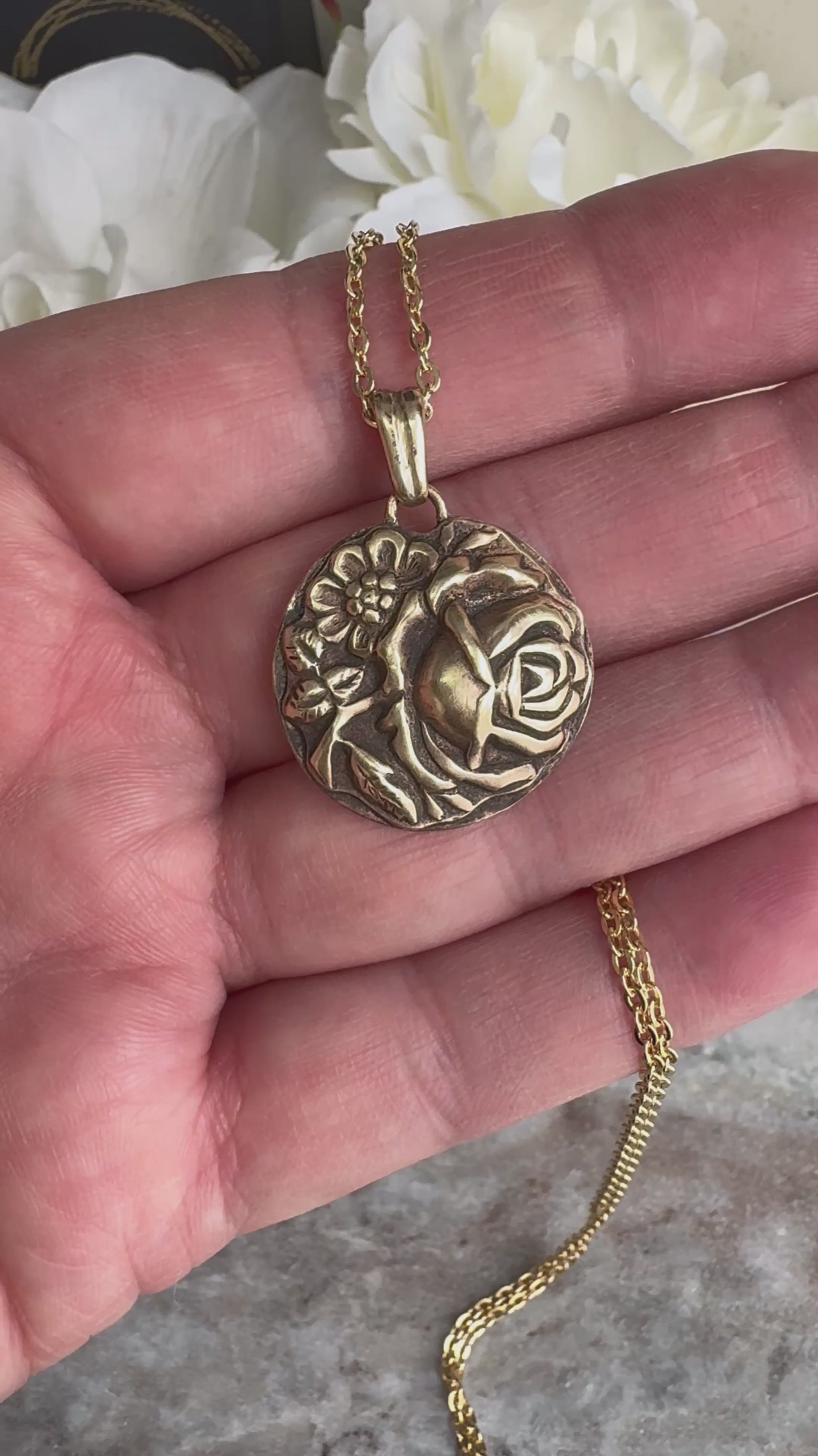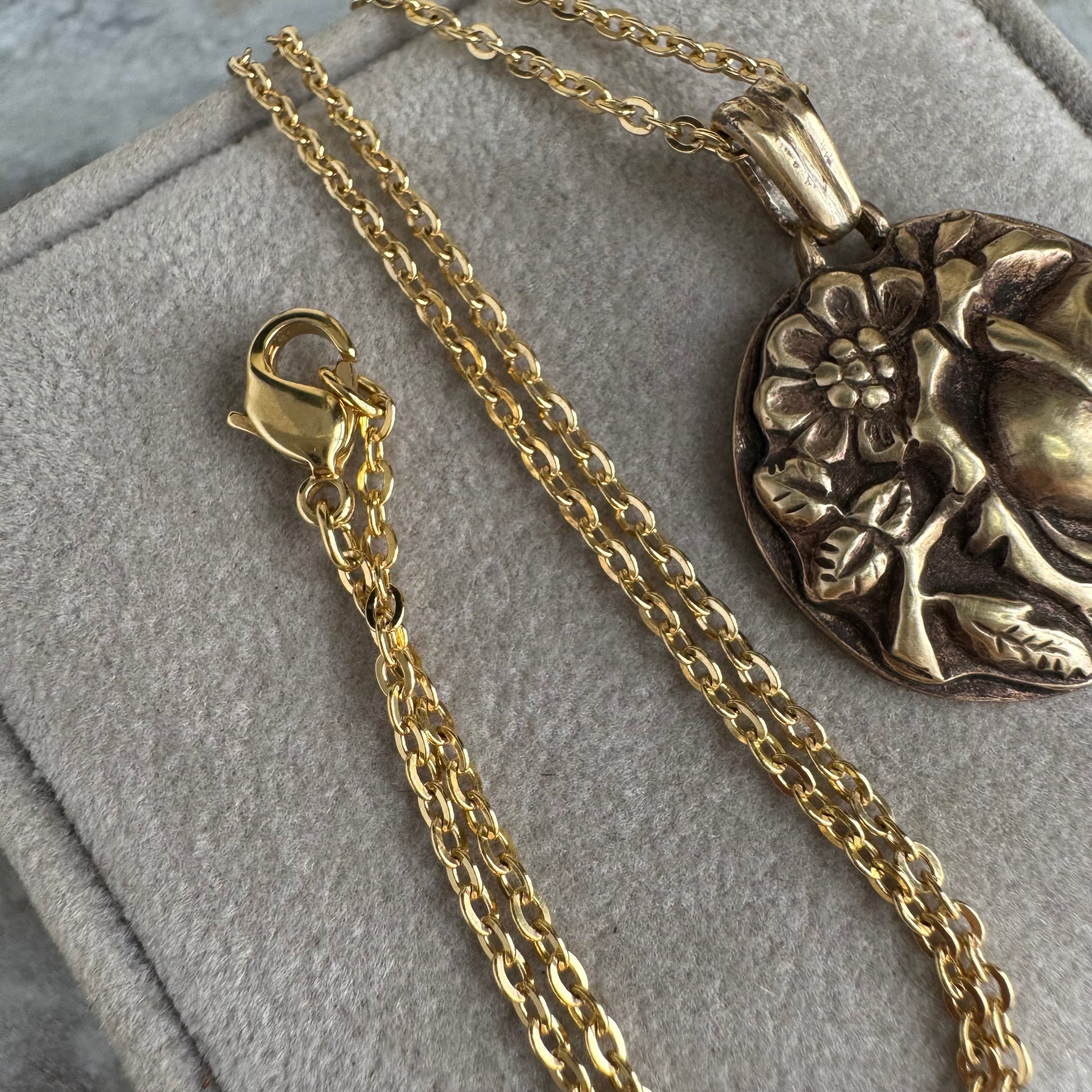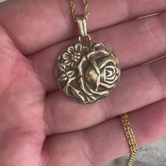 Vintage rose garden botanical bloom artisan gold brass necklace